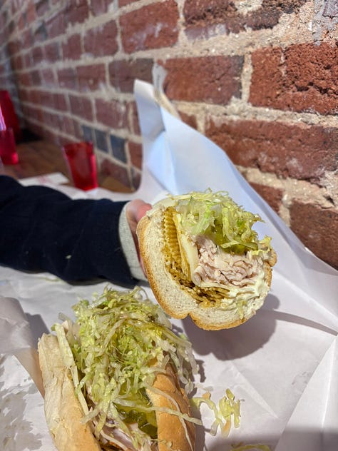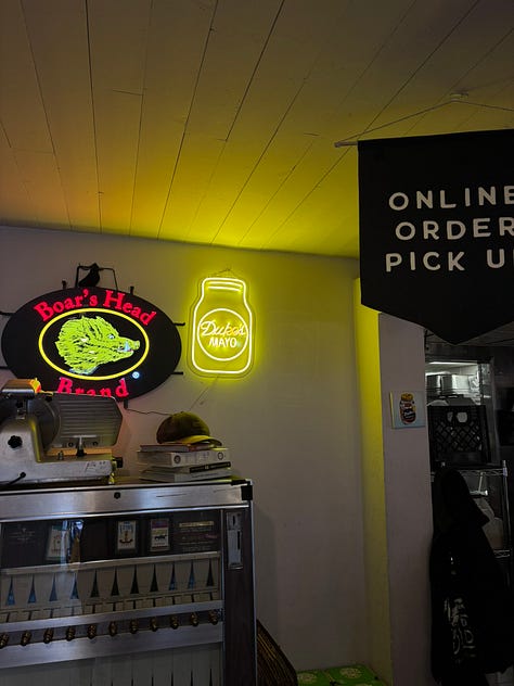 When Maura’s lunch hour hit, the storm passed, and we ventured out for Compliments Only. So so so so good! I especially loved the Crunchy Boi (an amped up turkey and cheese) and neon Duke’s jar on the wall above a candy cigarette machine.