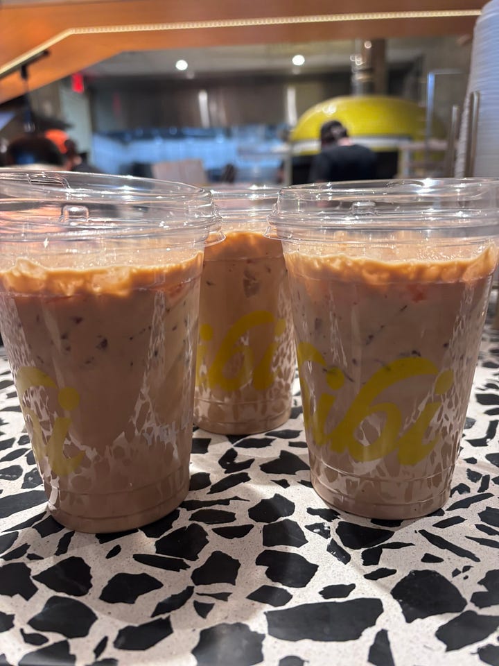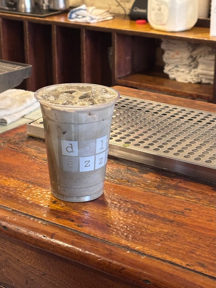 A block over we spotted Spot of Tea, and I’m happy to report that it is well worth the hype. Black Sesame Matcha for me (with an extra shot—a rec from the staunch matcha devotees online) and the Blue Jasmine for Maura.