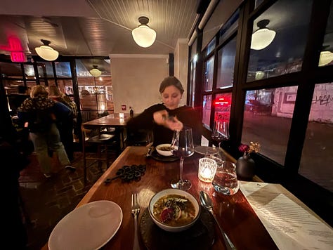 We did a lot of walking and talking this trip, which is what we usually do when Maura works from home, each around our own neighborhood with the face of the other on the screen of our phone. I felt like I was on the set of a movie I rewatch often with Maura pointing out all the spots she frequents throughout the week—the pharmacy, the coffee shop, the Safeway around the corner. She was especially excited to take me to Gemini, the natural wine shop in DuPont. We snagged a bottle to drink before dinner.