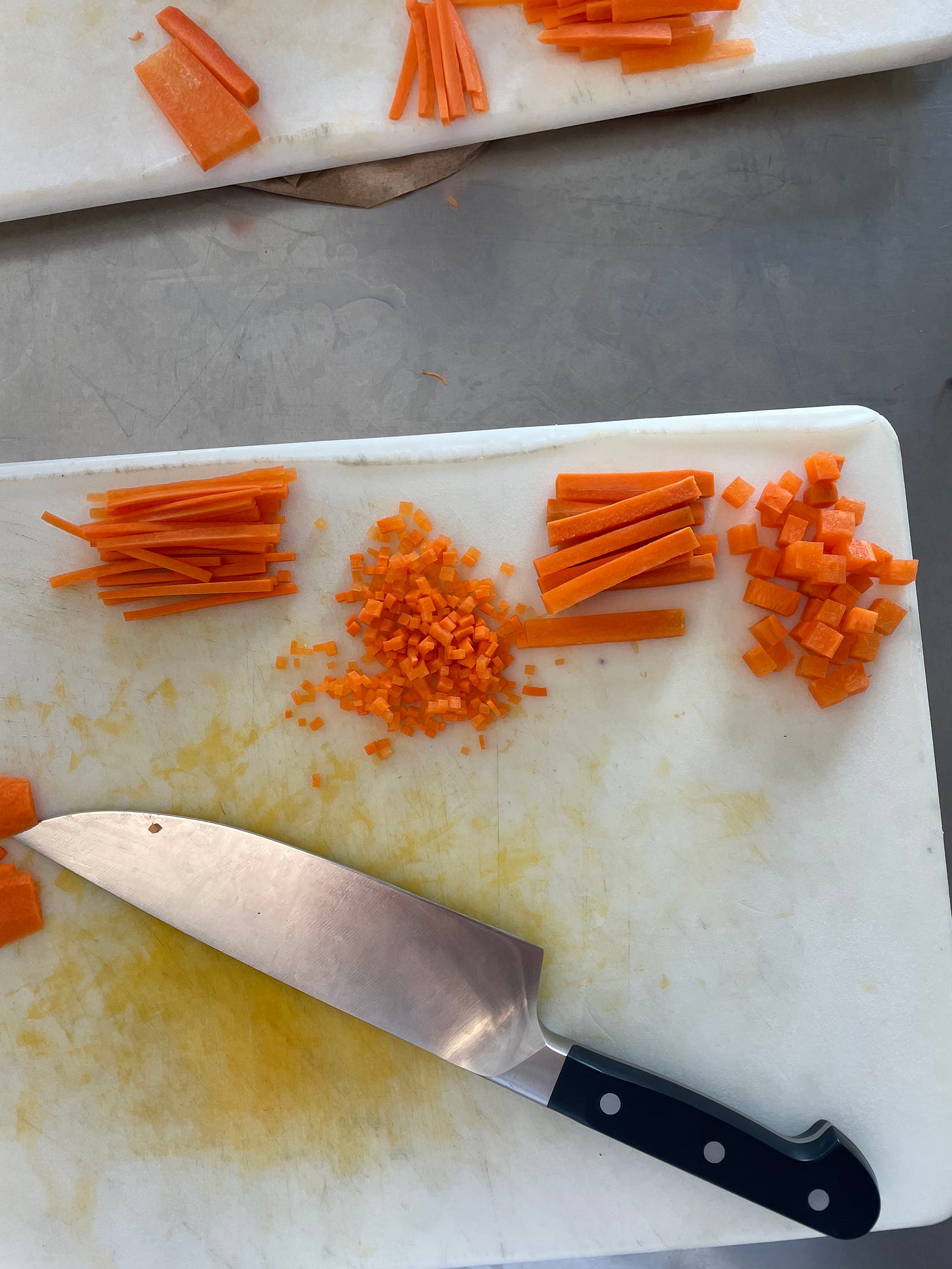 Homework aside, I’ve been having so much fun and learning a lot. We started with the basics, and each day we build upon it — knife cuts, stock production, and the natural order of setting up and breaking down the kitchen. And I mean really setting up and really breaking down. Tables get pushed around and then we drench the heck out of them with detergent and sanitizer. The floors get so messy with scraps that can’t be repurposed and splashes from straining stocks. I didn’t anticipate learning so much about sanitation and hazard controlling, but here we are! (I feel absolutely disgusted by my old clean-up habits in my own kitchen.)